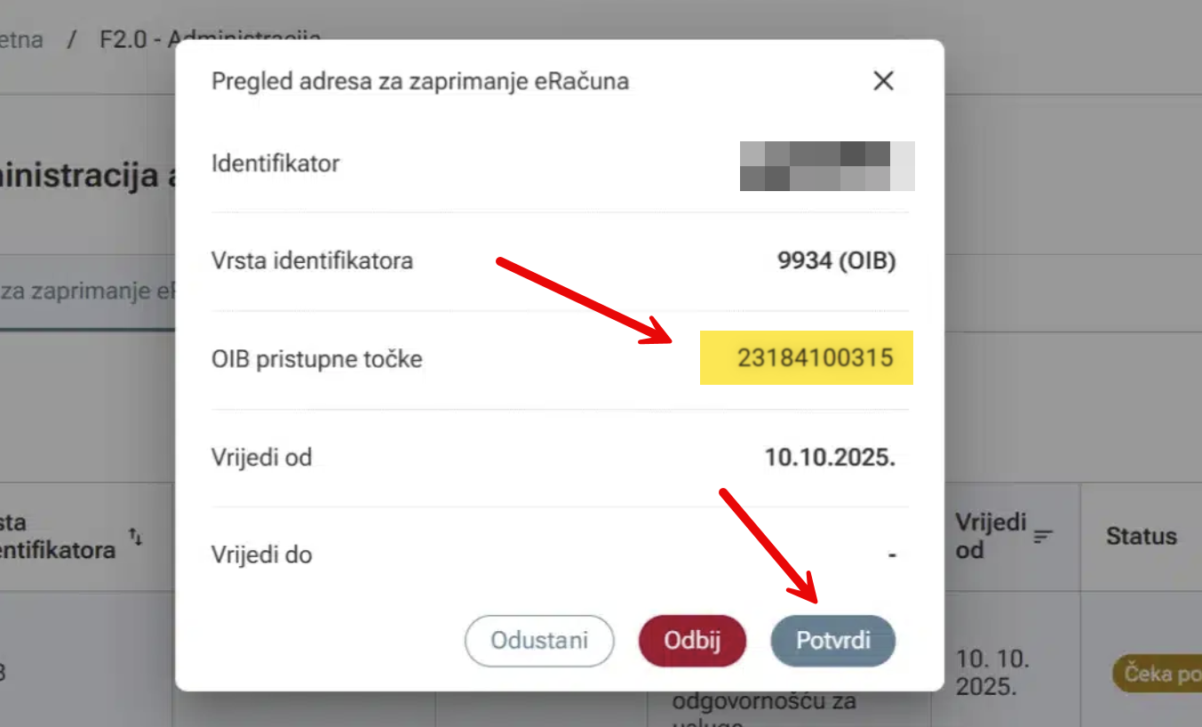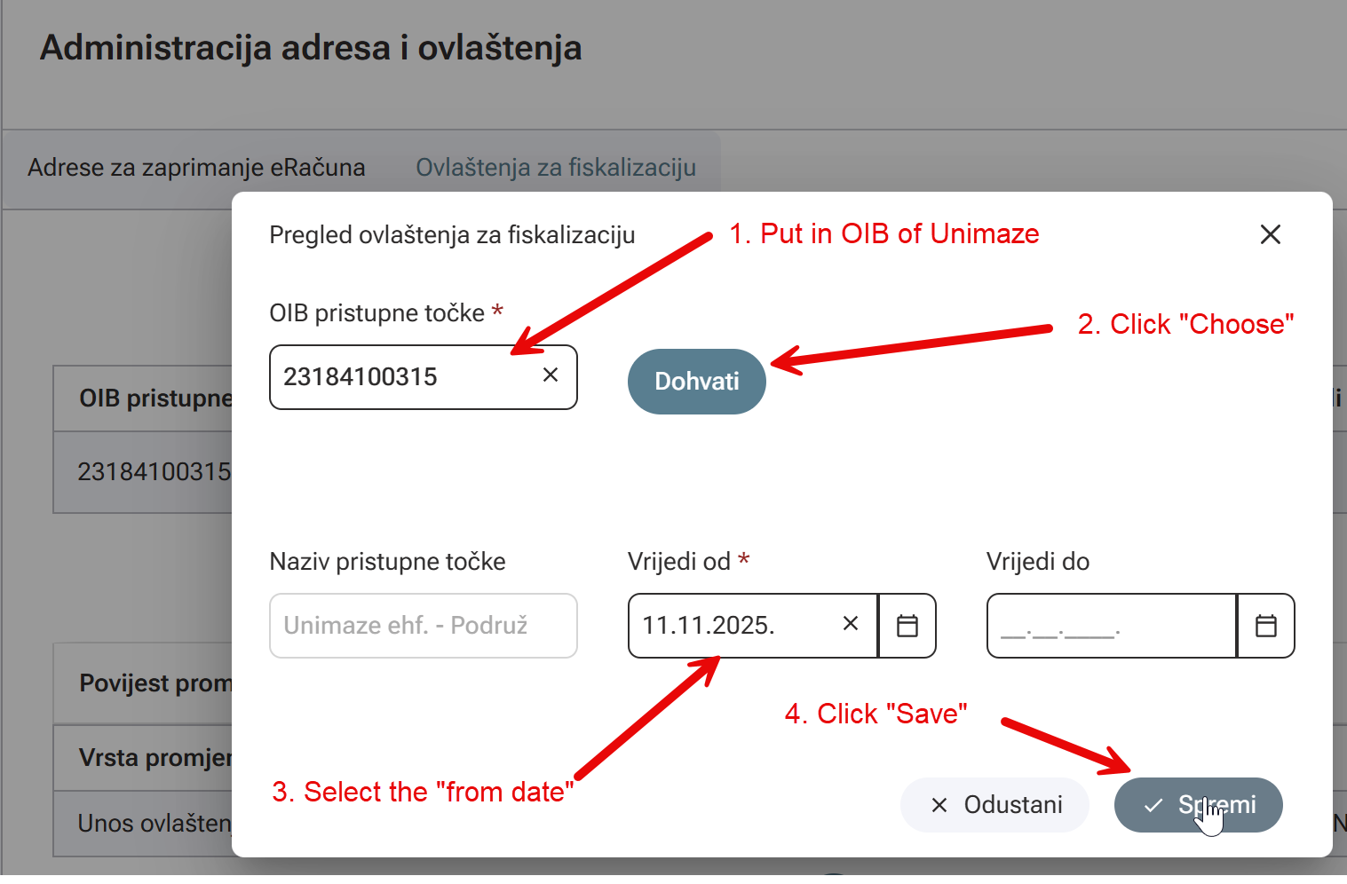 In the dialog enter Unimaze OIB number: 23184100315 and click Dohvati (choose). In the Virjedi od (valid from) field, enter today's date, then click Spremi (save).
