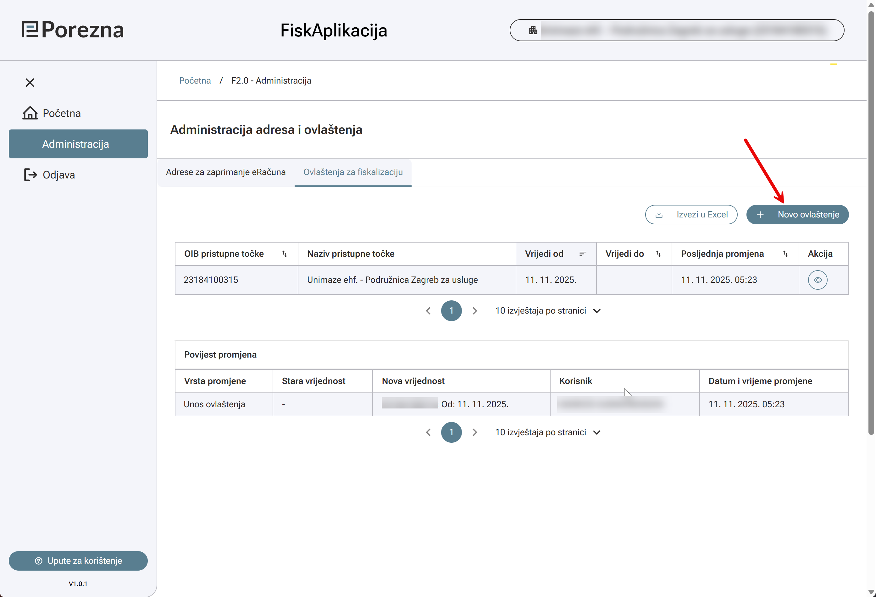 In there, click the option Novo ovlaštene (new authorization). This will open a dialog.