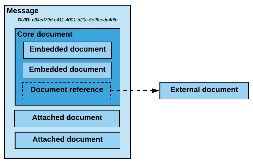 A message consist of the main business document (core) and supplementary documents which are embedded, attached or referenced.